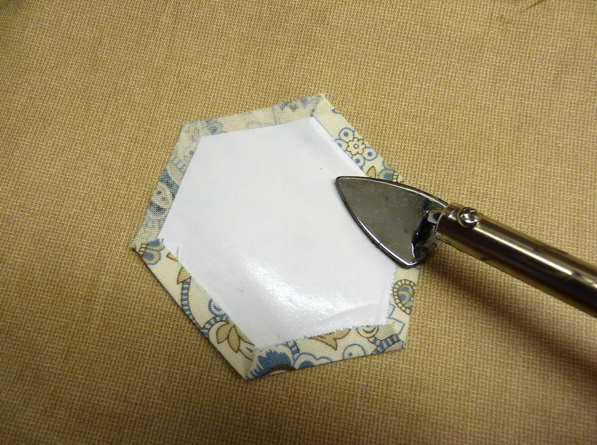 На глянцевую сторону бумаги для заморозки заутюживаю припуски ткани. Она прилипают хорошо, но не намертво, то есть легко потом можно их отделить от бумаги (как лейкопластырь снять).